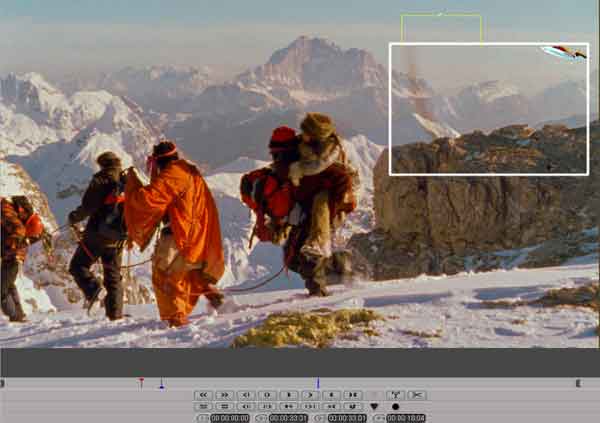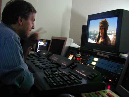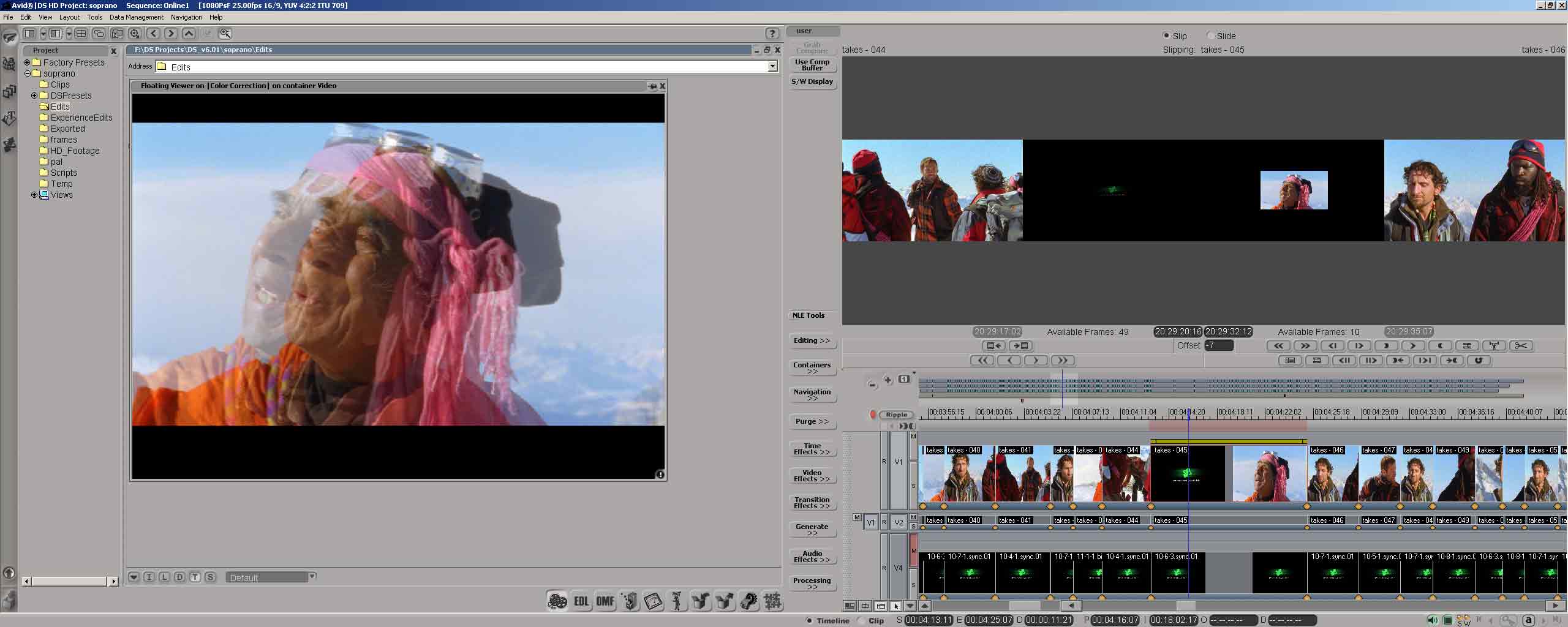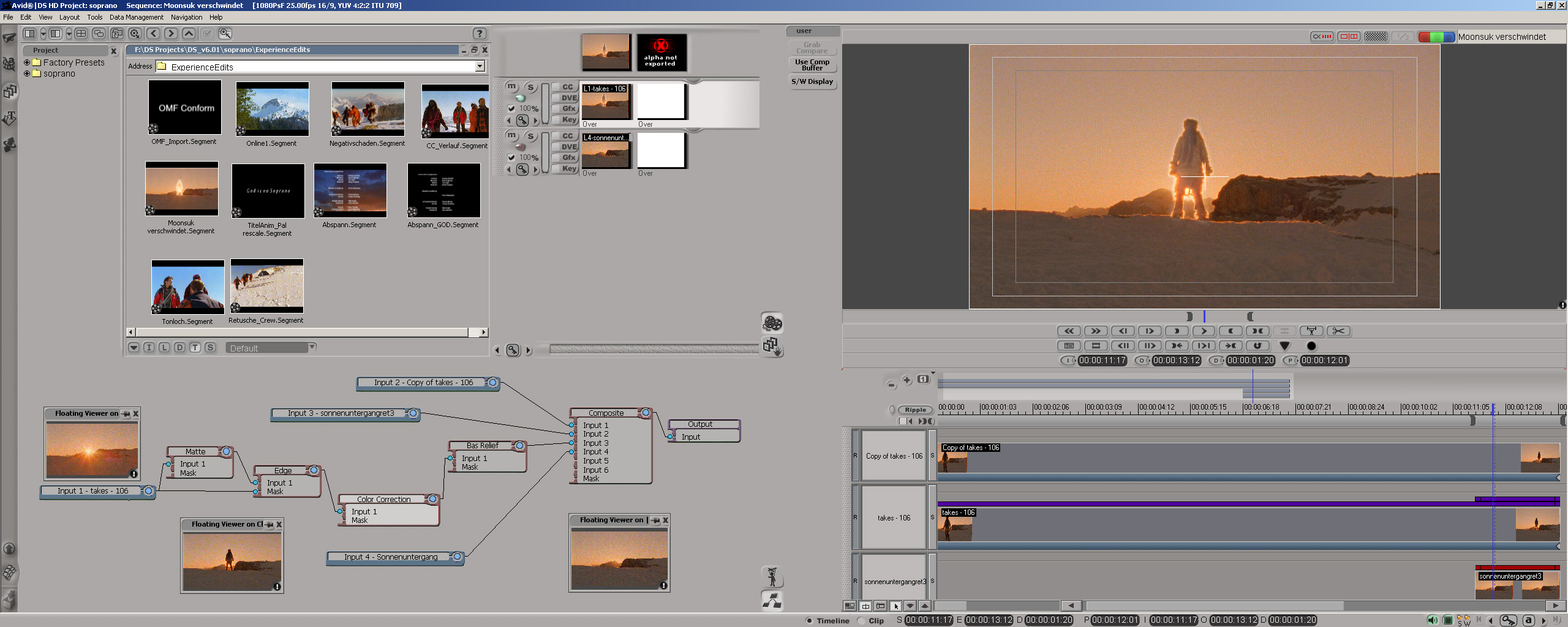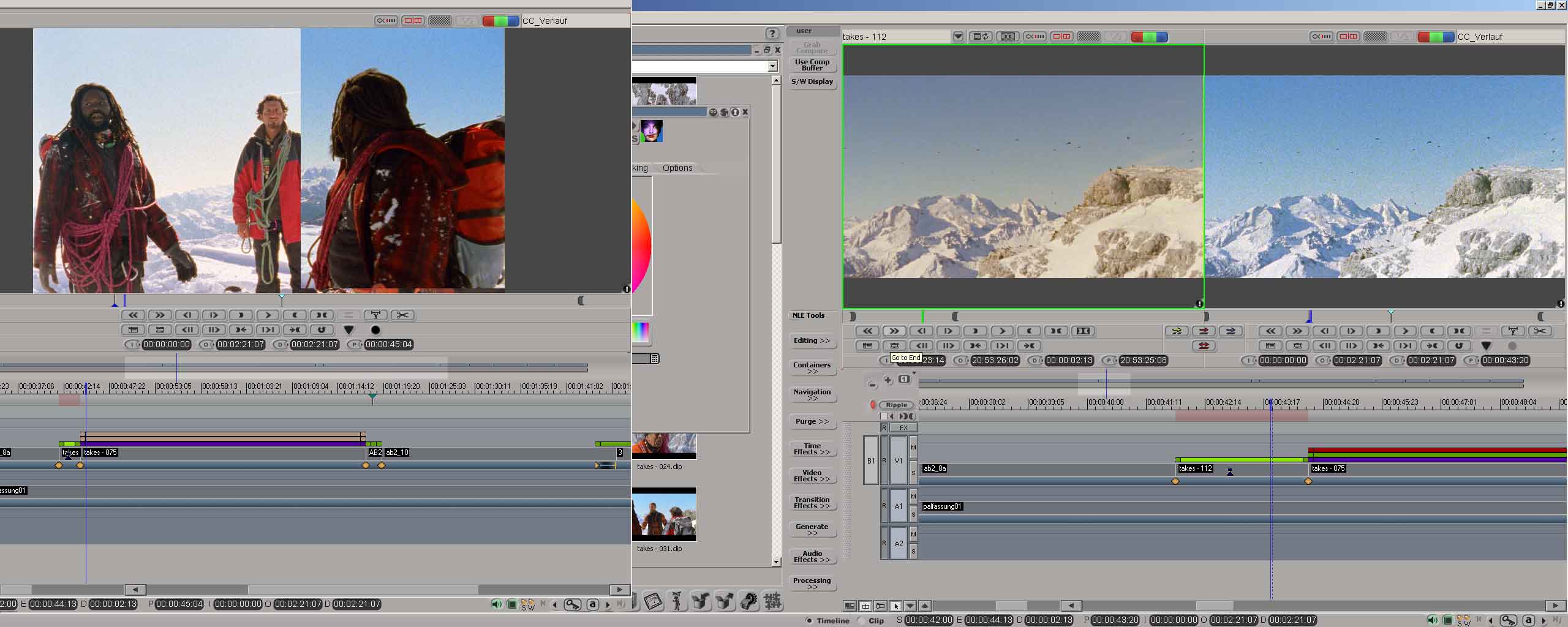 Da an der Telecine nur ein grob zusammengeschnittenes Negativ abgetastet werden konnte,waren Keycode für das HD-Fini hing nicht zu verwenden.Mit deren Hilfe hätte man den Offline-Schnitt vom Avid Media Composer zum Avid|DS 1:1 übernehmen können.Dies war aufgrund der Eigenschaften von 16mm Film (einseitig perforiert)und der Wetgate-Abtastung (Bildunruhe an den Klebestellen)nicht zu realisieren.Also musste der Film noch einmal „nachgeschnitten "werden. Der Offline-Schnitt wurde per OMF in das Avid|DS HD Systemimportiert und eine Offline PAL-Ausspielung in das HD-Projekteingespielt.Der OMF-Schnitt definierte hierbei die Schnittlängen in der Timeline,der PAL-Film diente als Referenz für den visuellen Nachschnitt. Der „OMF-Schnitt "wurde in eine Videospur abgelegt,die PAL-Ausspielung wurde in eine weitere Videospur gelegt.Mit einem DVE-Effekt wurde das PAL-Bild auf HD-Format skaliert und leicht transparent gemacht.Der digitalisierte HD-Masterclip von der Abtastung wurde in Subclips zerlegt -nun musste man nur noch "Schnitt für Schnitt "die Timeline abarbeiten.Fall das HD-Material nicht framegenau in die Avid|DS Timeline geschnitten war,wurde dies anhand der transparent darüber liegenden PAL-Spur sofort sichtbar,und der HD-Clip konnte durch „Slippen "in der Timeline auf leichte Weise synchron gezogen werden.