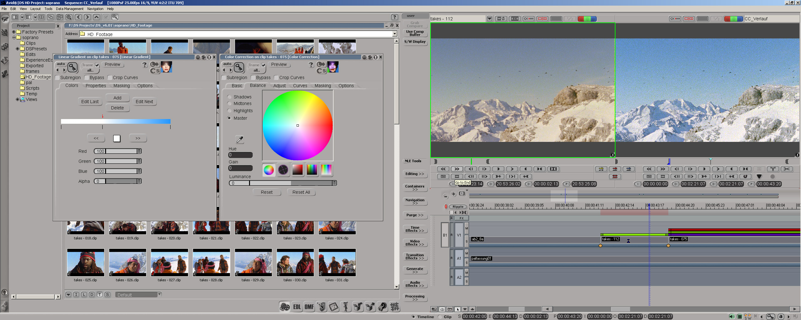 Man ging Frame für Frame durch, tippte einfach auf die Stelle mit dem Fehler/Fussel und konnte so, durch eine saubere Bildstelle, ersetzt werden. Dabei wurde je nach Voreinstellung des Clonetools dieselbe Stelle vom Frame vorher, mittels eines Brush-Punktes (mit weichem Verlauf zu den Außen-Kanten), darauf kopiert. Davon, wie "schnell" und einfach das ging, war selbst ein Filmprofi, wie Peter Deinas vom Scanwerk, überrascht. Da die Abtastung an zwei verschiedenen Tagen stattfand, gab es doch einige wenige aufeinanderfolgende Szenen, bei denen noch das Colormatching nachgeholt werden musste. Dies stellte auch im Avid®|DS kein Problem dar - ist aber auch vom Ideenreichtum des Operators abhängig. Zum Beispiel war in der einen Szene der Himmel viel zu hell und konnte allein durch die Farbkorrektur nicht dunkler gemacht werden. Also wurde ein blauer Verlauf auf den Himmel multipliziert und das Filmkorn blieb erhalten.