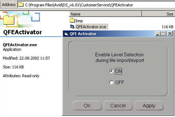 Für den Export des Filmes, aus dem HD-Projekt für die Ausbelichtung, wurde die Option für die Farbraumeinstellung aktiviert. Dazu musste das etwas „versteckte“ Programm QFE-Aktivator aufgerufen werden, welches Teil von v6.01QuickFix 2 ist (downloadbar auf http://www2.softimage.com/avidds/).